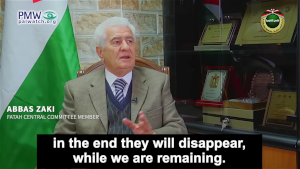 It also exemplifies another of the PA’s messages: That Israel will come to an end. Palestinian Media Watch has exposed numerous statements to that effect made by PA and Fatah officials. Fatah Central Committee member Abbas Zaki said earlier this year that both America and Israel “will disappear”:
