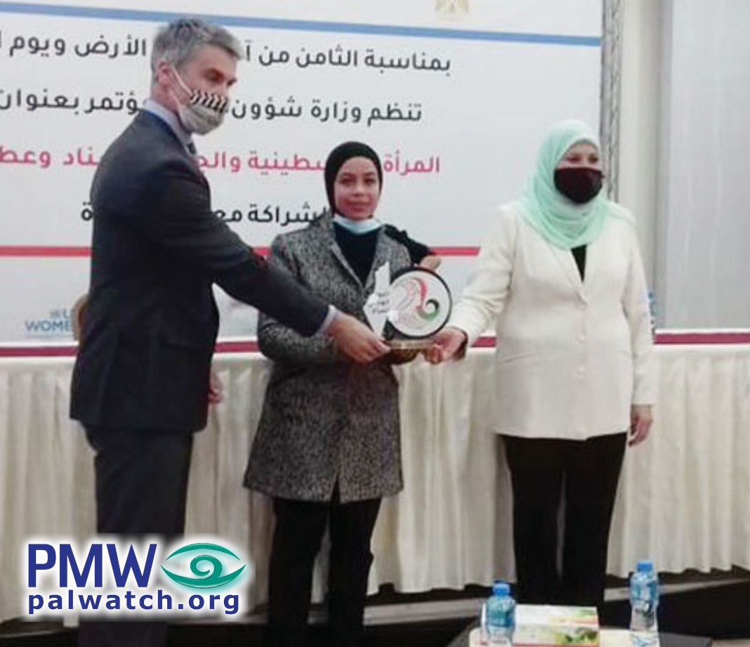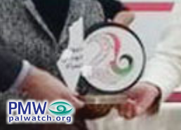 The article included a picture from the event showing Director of Cooperation in the Canadian Representative Office Jason Tulk on the left and PA Minister of Women’s Affairs Amal Hamad on the right awarding a woman with an honorary plaque, which features the PA map of “Palestine” that presents all of Israel together with the PA areas as “Palestine.”