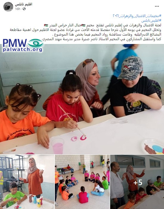 The Lion Cubs and Flowers Committee (i.e., Fatah youth institution for young boys and girls) at the [Fatah] Nablus branch launched the ‘Fire Mountains and Guardians of the Threshing Floor’ summer camp (“fire mountain” is a nickname for Nablus -Ed.). [Fatah Nablus] Branch Committee member Mai Qaradeh gave the summer camp a detailed explanation on Sunday [July 4, 2021] about the importance of boycotting the Israeli products.”