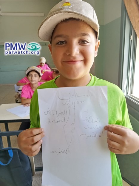 The image shows a young boy participating in the Fatah summer camp; the boy is holding up a drawing of the PA map of “Palestine” that presents all of Israel together with the PA areas as “Palestine,” with “Palestine” written at the top. To the north of “Palestine” is written “Lebanon,” to the east are “Syria” and “Jordan,” to the west is “the Mediterranean Sea,” and to the south is “the Gulf of Aqaba.” There is no mention of the State of Israel.