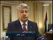 Palestinian Authority Minister of Labor in front of map erasing IsraelOfficial Palestinian Authority TV|Jan 31, 2011The PA Minister of Labor stands, in his office, in front of a map of "Palestine" that erases Israel during an interview on PA TV.