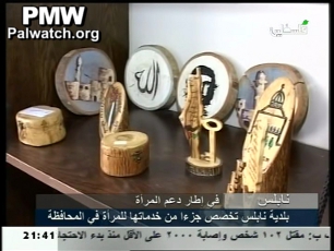 This map was shown as part of a report on women's craft classes, organized by the Nablus municipality. The map, which includes all of Israel, has a Palestinian flag painted on it and wooden key beside it.