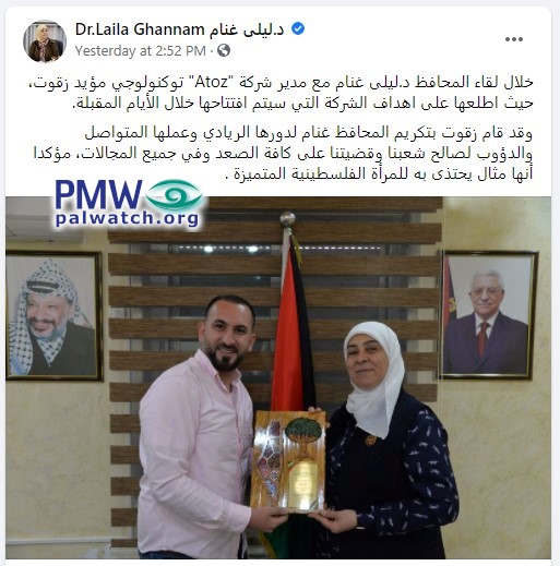 The image shows Ramallah and El-Bireh District Governor Laila Ghannam receiving an honorary plaque featuring the PA map of “Palestine” that presents all of Israel together with the PA areas as “Palestine.”