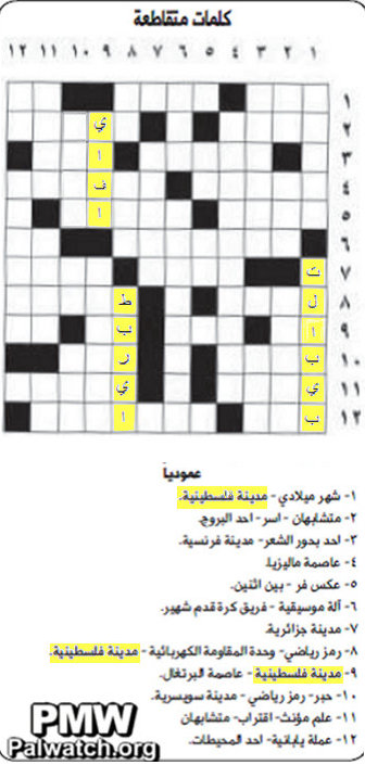 Palestinian Authority crossword defines Tel Aviv, Tiberias, and Jaffa as "Palestinian" cities