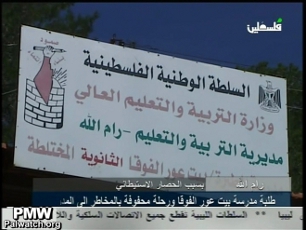 Text on sign: ”The Palestinian National Authority Ministry of Education administration – Ramallah Mixed [boys/girls] High School Al-Tireh-Upper Beit Our.