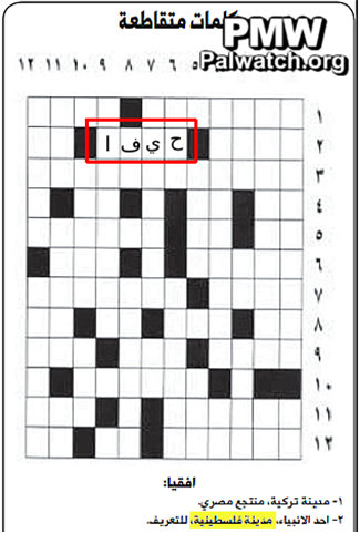 Palestinian Authority crossword calls Haifa a Palestinian cityAl-Hayat Al-Jadida, official PA daily |Mar 3, 2011Clue: “Palestinian city”Solution: “Haifa”