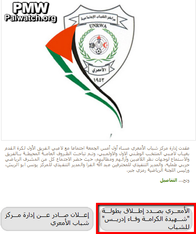 The Al-Amari Palestinian youth center has announced a football tournament for youth to be held later this week, named after the first Palestinian female suicide bomber Wafa Idris. The Al-Amari youth center's website displays its logo with UNRWA's (United Nations Relief and Works Agency) name in the center. On the home page, just below the logo and bordered in red, is the announcement of the Wafa Idris tournament.Click to view bulletin