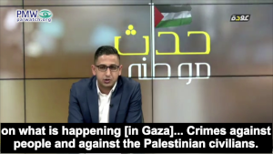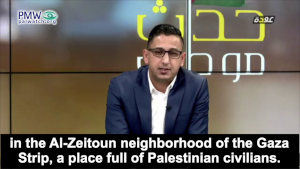Fatah-run Awdah TV host: “First, an explosion [occurred] in a popular market in the Al-Zeitoun neighborhood of the Gaza Strip, a place full of Palestinian civilians. A number of human rights committees and organizations, and also eyewitnesses and residents of the area confirmed that this storage area was used by the military wings of a number of factions in the Gaza Strip. This disregards the lives of the civilians, placing bombs, placing explosive devices, and explosives near the homes of the civilians and the homes of the Palestinians. Whoever’s home was saved from the [Israeli] aggression unfortunately was not saved from the bombs of relatives…
