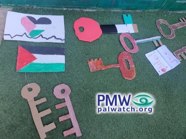 Another photo shows large keys made by the children, two of them in the colors of the Palestinian flag, symbolizing the Palestinian refugees’ “right of return”: