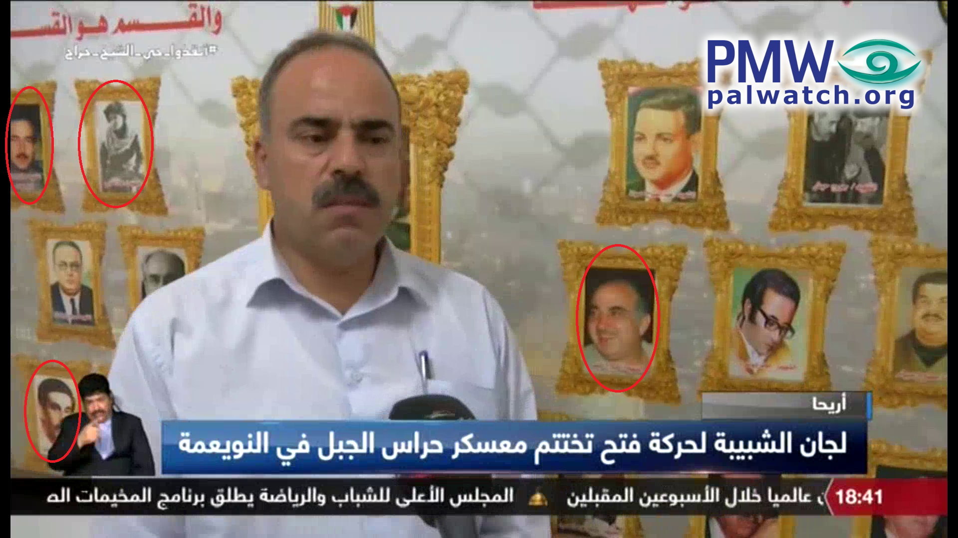 The screenshot from the official PA TV broadcast shows Fatah Nablus Secretary Muhammad Hamdan speaking in front of pictures displayed at the camp. In the top row of the pictures the first to the left is Abu Jihad, next is Dalal Mughrabi. Below her to the left is Abu Yusuf Al-Najjar. To the right of Hamdan in the second row is Abu Iyad.