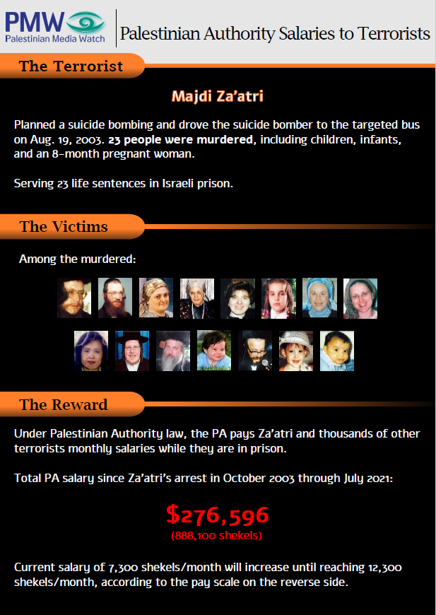 The monthly salary that the PA pays Za’atri currently stands at 7,300 Israeli shekels (over $2,162) a month, including a special addition of 300 shekels (over $93) a month that the PA pays terrorists who are residents of Jerusalem like Za’atri. As of the end of July 2021, the PA has already paid Za’atri no less than 888,100 shekels (over $ 276,596) as a reward for murdering 23 people. The PA has paid a similar amount to his two accomplices.