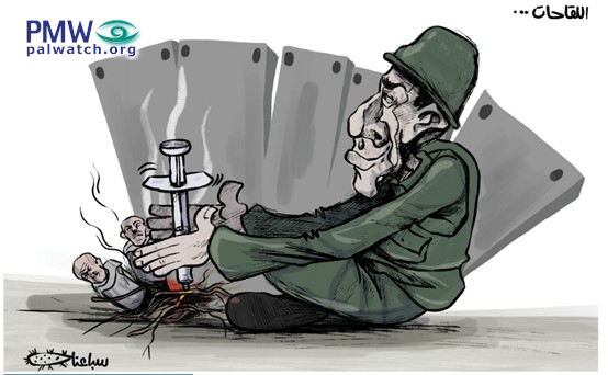Demonization: Palestinian Authority daily cartoon shows an Israeli soldier burning Palestinians with a Coronavirus vaccine needle
