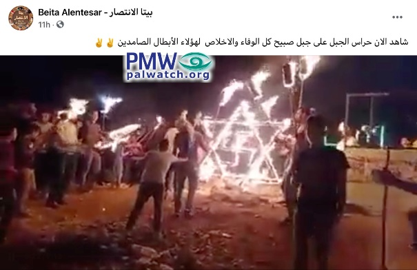 Text and images on the Facebook page ‘Beita Victory’ showed the effigy being built, and later burning, along with a large number of flammable torches for supporters to hold. The aim of the event, according to the Facebook page, was to “harass” Israel: