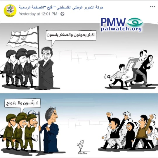 In the upper panel, former Israeli Prime Minister Golda Meir is standing holding an Israeli flag and talking to a group of armed Israeli soldiers; smoke is emitting from the barrel of one soldier’s assault rifle, indicating he recently fired it. A Palestinian father and mother are fleeing with a baby and a child who is carrying a key, which symbolizes “the right of return” of the Palestinian refugees. Golda Meir is saying to the soldiers: “The adults will die and the young will forget” – PMW was unable to find any record of Golda Meir making such a statement.