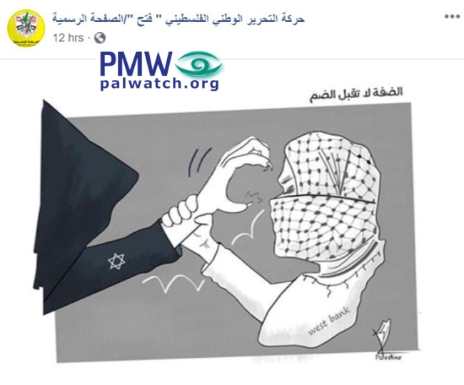 The cartoon shows the shape of the West Bank depicted as a man with his face masked by a keffiyeh (Arab headdress), with “west bank” written on it in English. The West Bank is grabbing the hand of a figure cloaked and masked in black with a Star of David on its sleeve – apparently a depiction of Israel as the angel of death – that is reaching for the West Bank’s face with long sharp fingernails. In the bottom right is the PA map of “Palestine” that presents all of Israel as “Palestine” together with the PA areas; the map is drawn in the shape of a Palestinian flag on a pole, with the stripes of the flag on the map. Under the map is written “Palestine” in English.