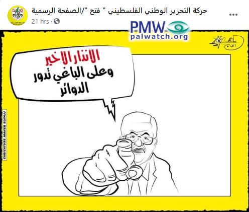 The cartoon shows PA Chairman Mahmoud Abbas pointing his finger and saying: “Last warning, the evil deeds will return and harm the evil one”