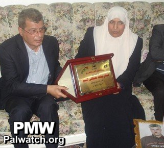Note: Terrorist Abbas Al-Sayid planned the Passover suicide bombing in 2002, in which thirty Israelis were killed. Al-Sayid is serving 30 life sentences for planning this attack. The photo in the PA daily shows the PA minister handing the family an honorary plaque from the PA. Terrorist Al-Sayid's name and the PA logo are visible on the plaque.