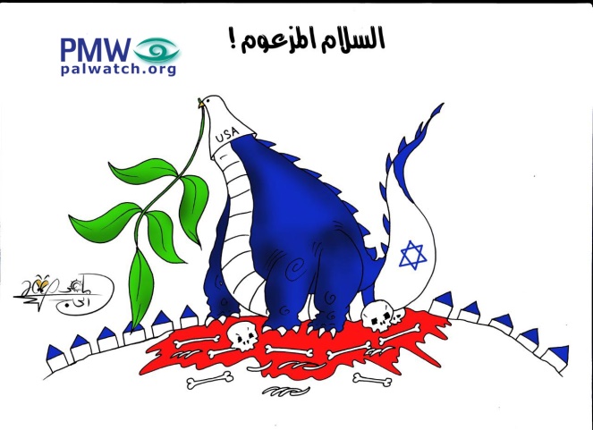 The cartoon shows a blue and white dragon with a Star of David on its tail covering its head with a dove mask with “USA” written on it; a large olive branch is in the dove’s beak. The dragon is standing on a pool of blood with skulls and bones littering the ground around it, and there are a row of white homes with blue roofs on the horizon apparently representing Israeli “settlement.”
