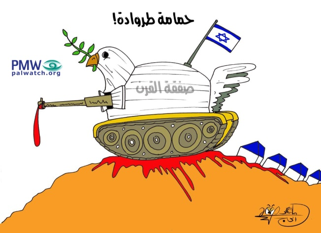 The cartoon shows a tank with the wooden shape of a dove covering its turret; the dove has an olive branch in its beak, an Israeli flag flying on top of its back, and the words “deal of the century” written on it referring to US President Donald Trump’s Middle East peace plan. Blood is dripping from the tank’s cannon, and it is on top of a pool of blood. In the background is a row of white houses with blue roofs apparently representing Israeli “settlement.”