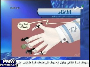 Cartoon depicts Israel as a hypocrite that talks peace while engaging in warOfficial Palestinian Authority TV|May 2, 2011This cartoon sends the message that Israel is duplicitous, talking peace while still engaging in war. Text: "We extend our hand in peace"