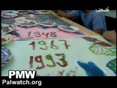 This visual appeared in a music video of a song encouraging Palestinians to overcome their tragedies. Children are seen sitting around a table drawing. One drawing included in the video shows the dates "1948, 1967, 1993."Click to view bulletin