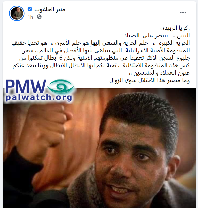 Senior Fatah official Munir Al-Jaghoub, head of the Fatah Mobilization and Organization Commission’s Information Office, celebrated the escape of six terrorists from Gilboa Prison this morning with a post he published on his Facebook page and Twitter account: