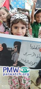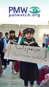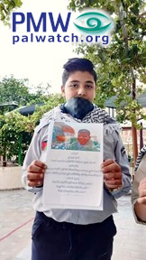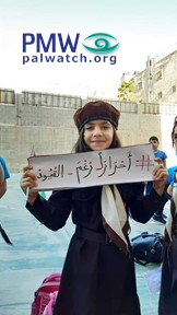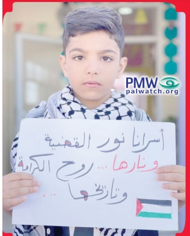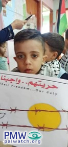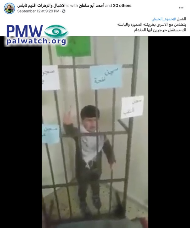 In a video posted on the Facebook page of “the Lion Cubs and Flowers Institution” – the Fatah Youth Institution for Young Boys and Girls – Nablus Branch, the child Hamza Al-Habash is standing behind mock prison bars with signs on them, calling for “Freedom to our heroic prisoners”: