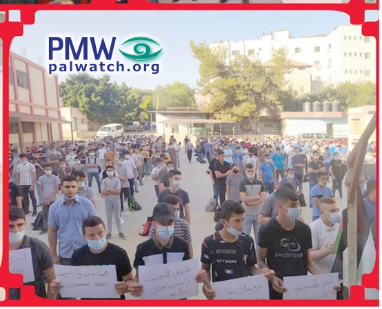 The picture shows children and adults at the school holding signs with the names of escaped terrorists, a sign with the text: “The creators of freedom,” Palestinian flags, and a yellow Fatah flag.