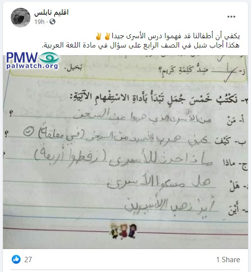 One example illustrates how central the message that terrorists are heroes is and how important it is for the PA and Fatah to get it across to children. Fatah posted the answers given by a 4th grader who chose to write sentences about the 6 escaped terrorists for an assignment on interrogatives. Fatah said the boy had “understood the lesson of the prisoners well”: