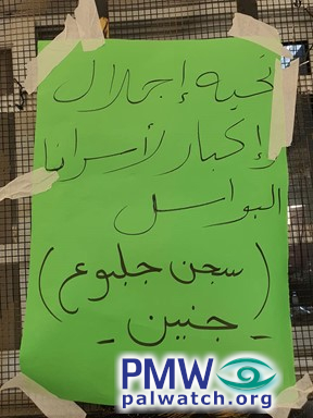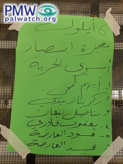 The picture shows posters on the left with images of former PLO and PA Chairman Yasser Arafat, and a poster in the center with text honoring the terrorists.