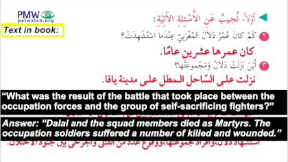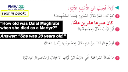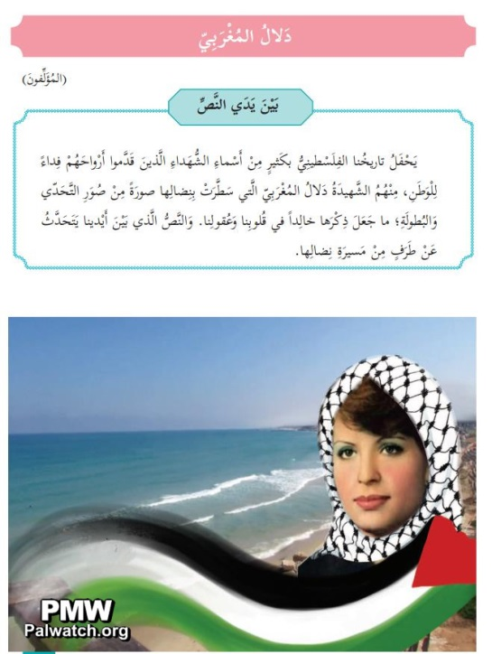 Lesson includes praise for terrorist murderer: “Dalal rode the sea while leading her group of [13] self-sacrificing fighters… Dalal and eight of her heroic squad members ascended to Heaven as Martyrs… [Dalal] watered the soil of Palestine with her pure blood, and brought to bloom a history full of unrelenting revolution"