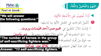 PA teacher Nasser Al-Rajabi reads from the PA 5th Grade Arabic Language Schoolbook: “Dalal rode the sea while leading her group of [13] self-sacrificing fighters… Their rubber boat capsized and two of the group's heroes drowned… Her group saw the lights of the Palestinian (sic., Israeli) coast, and they snuck ashore… Dalal took a handful of the soil of her bleeding homeland, and passionately inhaled its scent… With her group she stopped one of the buses... Dalal boarded the bus standing tall, and said to the people inside: ‘We don’t want to kill you, we have come in order to rescue our brothers who are prisoners in your prisons... We are a people who demands its right to its homeland, which you have stolen.’ Then she took out the flag of Palestine from her bag, kissed it, and hung it inside the bus… They [the Israelis] appointed a special unit of the army under the command of [future Israeli PM] Ehud Barak to attack the bus with machine guns and shells, while using aircraft and tanks, and to kill everyone in it… Many of the passengers were killed and Dalal and eight of her heroic squad members ascended to Heaven as Martyrs… [Dalal] watered the soil of Palestine with her pure blood, and brought to bloom a history full of unrelenting revolution."