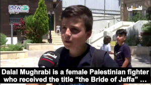 PA TV boy host 1: “Dalal Mughrabi [was] a young female Palestinian fighter who was called ‘the Bride of Jaffa.’ She led an operation to hijack a bus of soldiers (sic.) in Israel in 1978, which led to the killing of more than 30 Israelis (i.e., civilians). She died as a Martyr during the operation, together with other resistance members…”