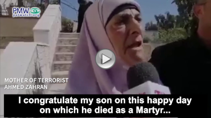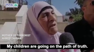 Mother of terrorist Ahmed Zahran: “[The Jews] have been our enemies since the days of the Prophet, May Allah take revenge on them in this world and in the Afterlife... I congratulate my son on this happy day on which he died as a Martyr... I am proud of my children. I am proud of them. They are not spies, not land sellers, not collaborators, not drug addicts, and not gamblers. My children are going on the path of truth.”