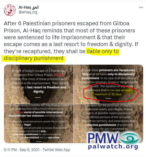 Following the escape of the Palestinian terrorists from Israel’s Gilboa Prison at the beginning of September 2021, the Palestinian NGO Al-Haq also weighed in on this subject, publishing a tweet in which it claimed that if the terrorists were re-arrested they would be “liable only to disciplinary punishment” that “shall in no case exceed a maximum of 30 days.”