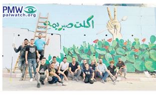 The article includes a picture of the mural, in which a hand is seen holding a spoon indicating the spoon used by the terrorists to dig a tunnel out of Gilboa Prison; the hand is making a “V” for “victory” with its fingers.