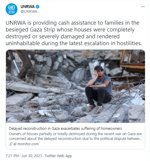 Following the May 2021 conflict, UNRWA unreservedly announced on its Twitter account that the agency is providing cash assistance to families in Gaza whose houses were destroyed or rendered uninhabitable.