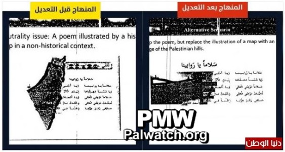 Examples of the changes that UNRWA made were depicted in a number of images of pages from the PA textbooks showing the original edition on the left side (yellow label) with “The textbook before the change” written above it and the new edition with suggested UNRWA changes on the right (red label) with “The textbook after the change” written above it: