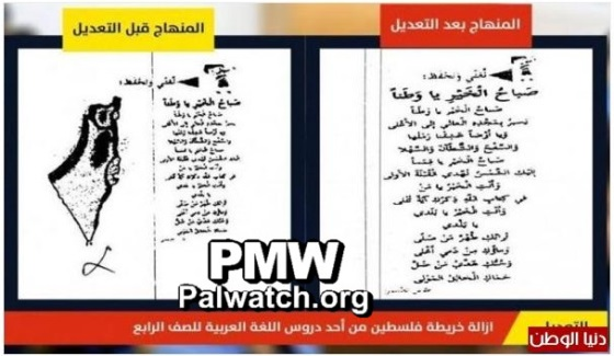 Text at bottom of image: “The change: Removing the map of Palestine from one of the Arabic language lessons for fourth grade”