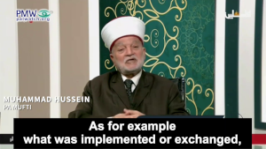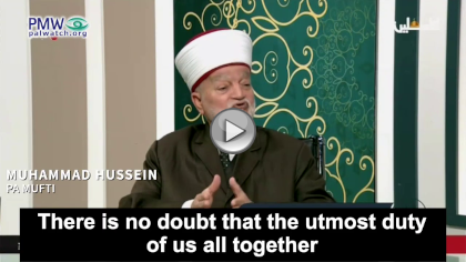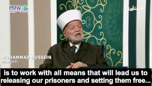 PA Mufti Muhammad Hussein: “There is no doubt that the utmost duty of us all together in the PA, in the society, and everywhere is to work with all means that will lead us to releasing our prisoners and setting them free… As for example what was implemented or exchanged, and this happened more than once in the prisoner exchange deals. The most known was the 1985 [Jibril Exchange], and before and after it were deals that included large exchanges of prisoners between us and the occupation.”