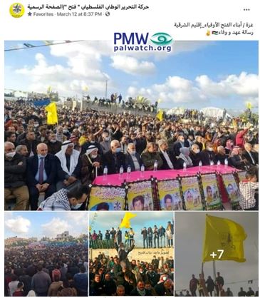 The images show a large Fatah rally in Gaza, in which yellow flags are seen bearing the Fatah logo that includes a grenade, crossed rifles, and the PA map of “Palestine” that presents all of Israel together with the PA areas as “Palestine.”