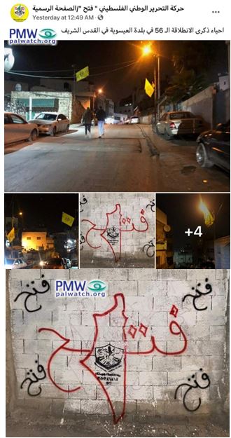 Posted text: “Marking the 56th anniversary of the Intilaqa (i.e., the anniversary of “the Launch” of Fatah, counted from its first terror attack against Israel) in the town (sic., neighborhood) of Issawiya in exalted Jerusalem.”