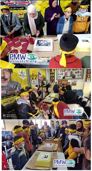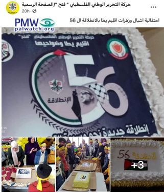 The images show children standing around a table with cakes on it. On one of the cakes is a logo for the 56th anniversary of “the Launch” of Fatah, counted from its first terror attack against Israel. On the right side of the logo is the number “56”; at the bottom of the logo is the PA map of “Palestine” that presents all of Israel together with the PA areas as “Palestine”; circling the logo is the Palestinian flag; in its center is the Fatah logo that includes a grenade, crossed rifles, and the PA map of “Palestine,” with “Intilaqa” which means “the Launch” written underneath it; and inside the number “5” is an image of former PLO and PA Chairman Yasser Arafat.