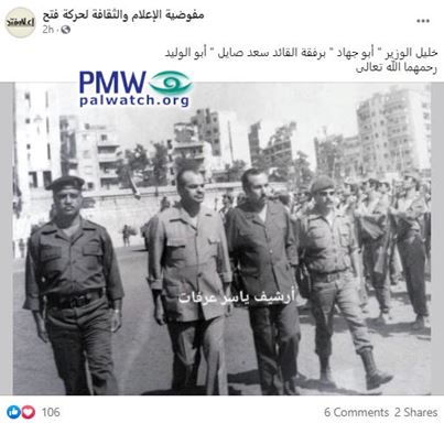 Posted text: “Khalil Al-Wazir ‘Abu Jihad’ (i.e., terrorist, responsible for murder of 125) together with leader Saad Sayel ‘Abu Al-Walid’ (i.e., former head of PLO terror forces in Lebanon)
