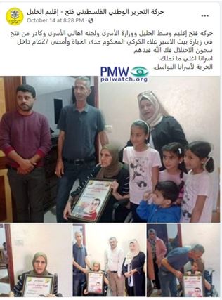 Posted text: “The Fatah Movement central Hebron branch, the [PA] Ministry of Prisoners’ [Affairs], the committee of the prisoners’ families, and Fatah members in a visit to the home of prisoner Alaa Al-Karaki (i.e., terrorist, murdered 1 person together with accomplices), who is serving a life sentence and has served 27 years in the [Israeli] occupation’s prisons – may Allah release their chains