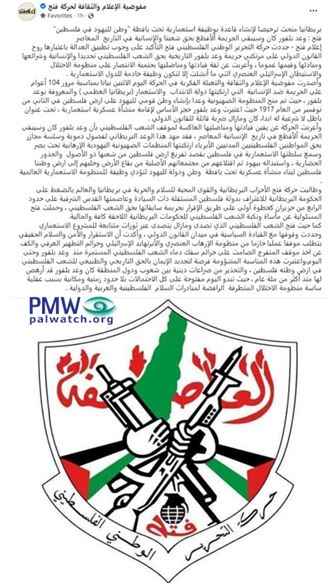 Posted text: “The [Fatah] Movement Commission of Information, Culture, and Ideology issued a statement today, Monday [Nov. 1, 2021], for the 104th anniversary of the crime against humanity that was committed by the mandate and colonialism state (Great Britain), which is known as ‘the Balfour Promise’ (i.e., Declaration), in which on Nov. 2, 1917, it was promised to the Zionist system that a national home would be established for the Jews on the land of Palestine.The Balfour Promise was considered the cornerstone a colonialist military apparatus (i.e., the State of Israel)…