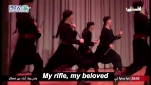 As a cultural feature, official PA TV broadcast a love song to the rifle. Men and women perform a dance to a song that lauds the rifle as “my beloved”: