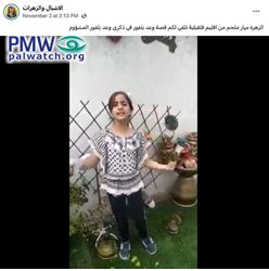 Posted text: “The flower (i.e., girl) MayarMelhem from the [Fatah Youth Institution for Young Boys and Girls] Qalqilya branch reads aloud for you the story of the Balfour Promise (i.e., Declaration) on the anniversary of the wretched Balfour Promise.”