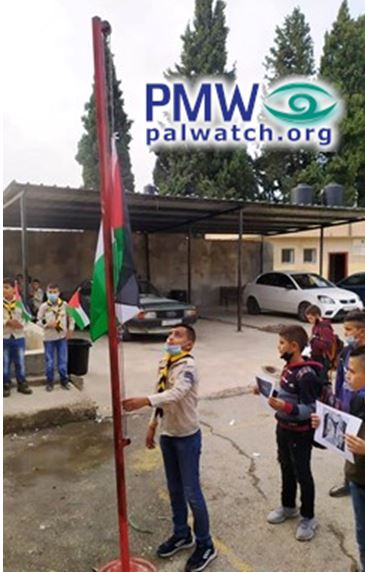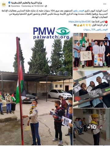 Posted text: “Today [Nov. 2, 2021], the [PA] Ministry [of Education] marked the anniversary of the wretched #Balfour_Promise (i.e., Declaration), after the 104 years have passed. The school students participated in the school recitation activities, carried signs condemning this sorrowful anniversary, and flew the flags at half-mast.”
