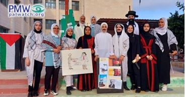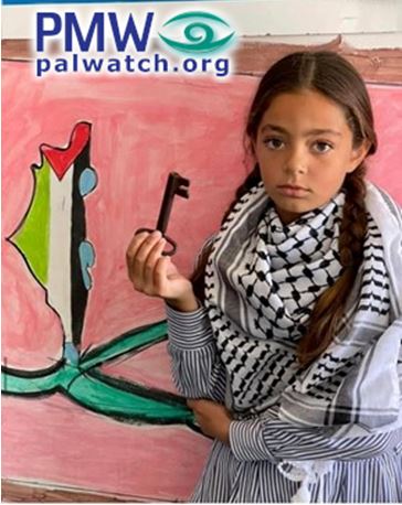 The following image shows a student wearing a keffiyeh (Arab headdress) and holding a key symbolizing the Palestinian refugees’ “right of return,” while standing next to a painting of the PA map of “Palestine” that presents all of Israel together with the PA areas as “Palestine” in the colors of the Palestinian flag.